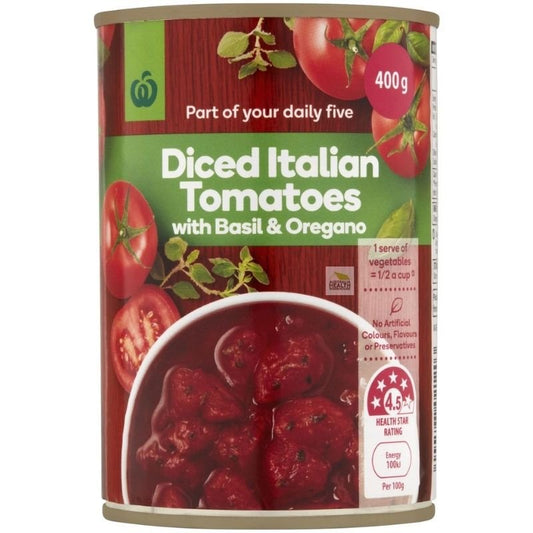 [Expiry: 31/08/2027] Woolworths Diced Italian Tomatoes Basil & Oregano 400g