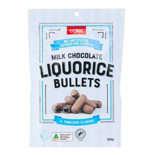 [CLEARANCE Expiry: 05/08/2025] Coles Milk Chocolate Liquorice Bullets 226g