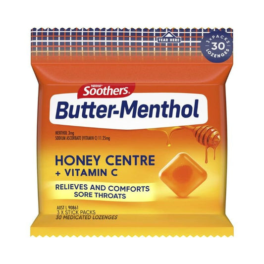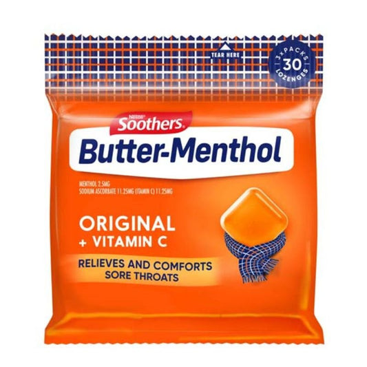 [Expiry: 03/2026] Soothers Butter-Menthol Original + Vitamin C Sore Throat Lozenges 30 Multipack