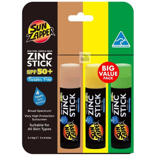 Sun Zapper Zinc Sticks SPF 50+ Mixed Pack 3 x 12g Skin Tone, Yellow & Green