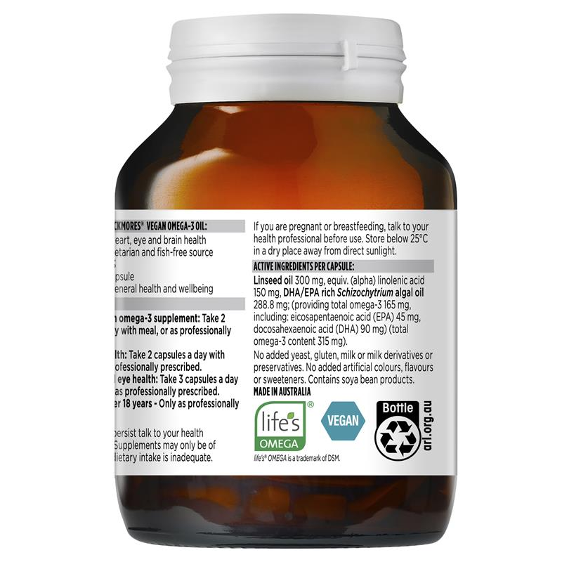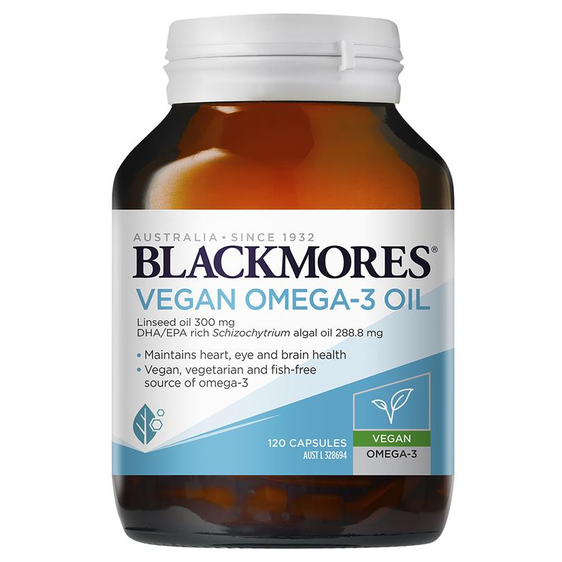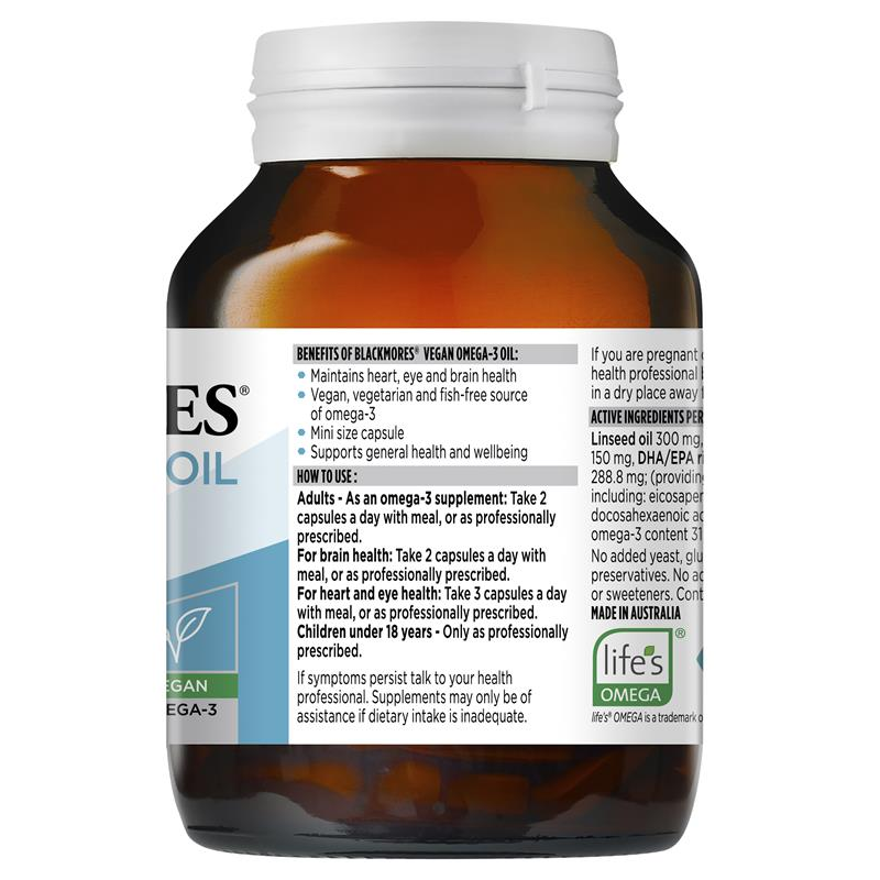 Blackmores Vegan Omega-3 Oil is a high-quality vegan, vegetarian and fish-free source of omega-3 that maintains heart, eye and brain health. It provides the same total omega-3 dose per capsule as Blackmores standard fish oil in an easy to swallow mini-size capsule. All Blackmores omega-3 oil is rigorously tested for mercury.