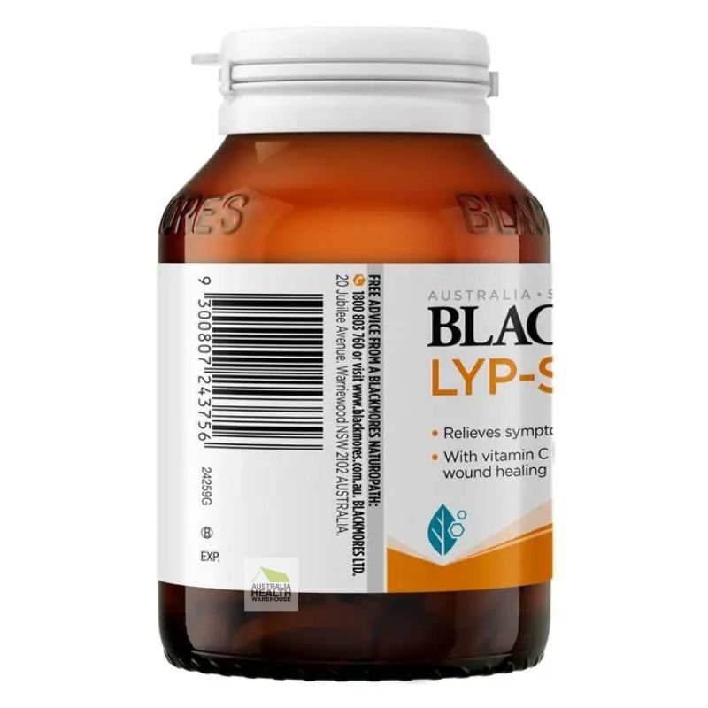 Blackmores Lyp-Sine provides 500 mg lysine, plus vitamin C and zinc, to relieve symptoms of facial cold sores, support immune system health, support wound healing, and support collagen formation. Take one tablet daily or as needed.