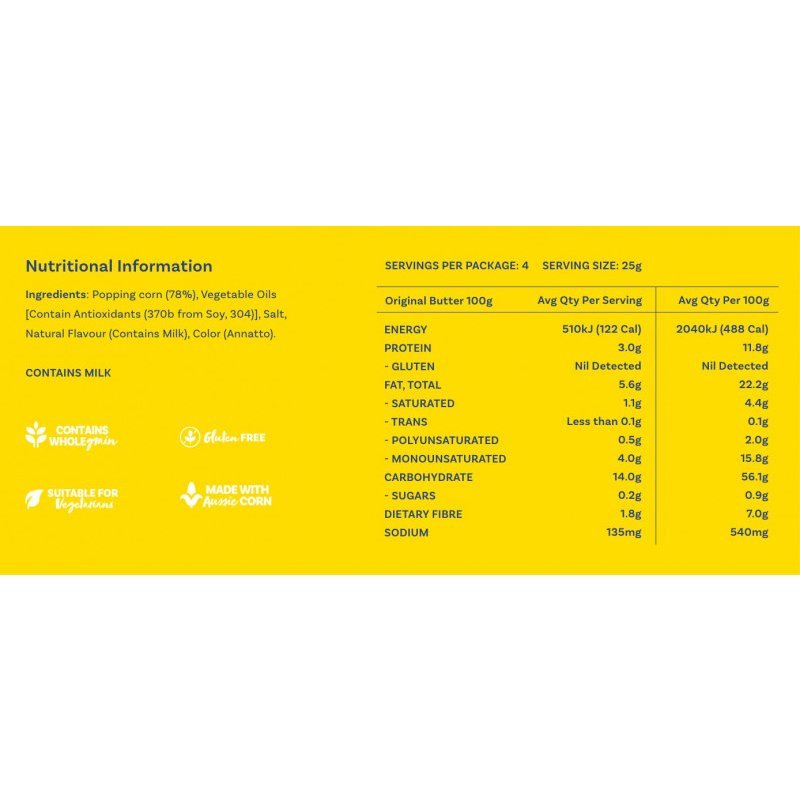 Poppin Microwave Popcorn Original Butter Flavour is the perfect treat for your movie nights! This crunchy snack is made by combining Australian corn kernels with just the right amount of buttery flavoured goodness. Ready in minutes, simply place in the microwave, cook, and enjoy warm freshly popped popcorn! The popcorn is full of wholegrain goodness, it makes a great and light snack for anytime, all the time!