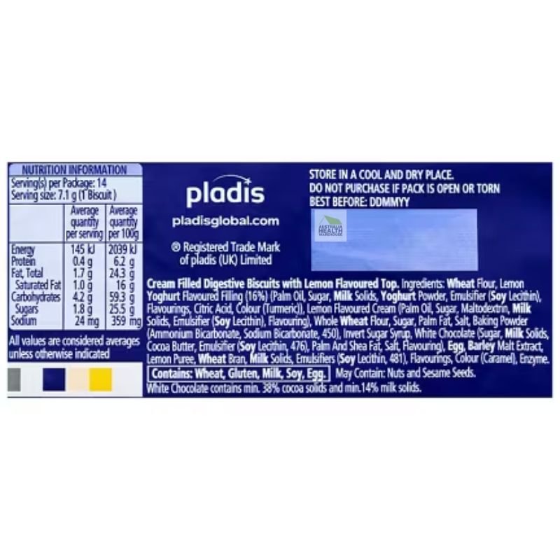 Wheat Flour, Lemon Flavoured Yoghurt Filling (16%) (Milk Solids, Palm Kernel Fat, Sugar, Yoghurt Powder (Milk, Culture), Emulsifier (322) (Soy), Flavouring, Acidity Regulator (330), Turmeric), Lemon Flavoured Cream (13%) (Palm & Palm Kernel Fats, Sugar, Maltodextrin, Milk Solids, Emulsifier (322) (Soy), Flavouring), Whole Wheat Flour, Sugar, Palm Fat, White Chocolate (Sugar, Milk Solids, Cocoa Butter, Emulsifiers (322 (Soy), 476), Salt, Vanilla), Invert Syrup, Lemon Puree (1%), Malt Extract (Barley), Wheat Bran, Raising Agents (500, 503, 450), Milk Solids, Salt, Emulsifiers (481, 322 (Soy)), Flavouring, Egg, Colour (150a), Enzyme, White Chocolate contains min. 38% Cocoa Solids and min. 14% Milk Solids.