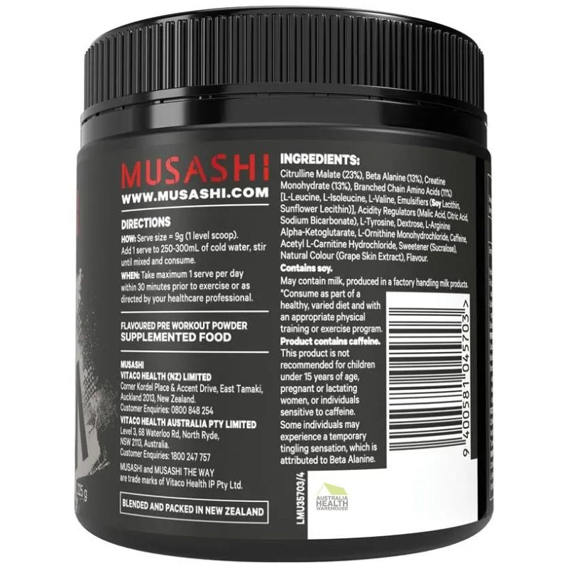 Musashi Pre-Workout is a unique formulation that contains a blend of Citrulline, Beta-Alanine, Caffeine, Creatine and Amino acids to act as a pre-workout catalyst to take your game or gym session to the next level. This refreshingly delicious blend is scientifically formulated to support your sports nutrition needs.